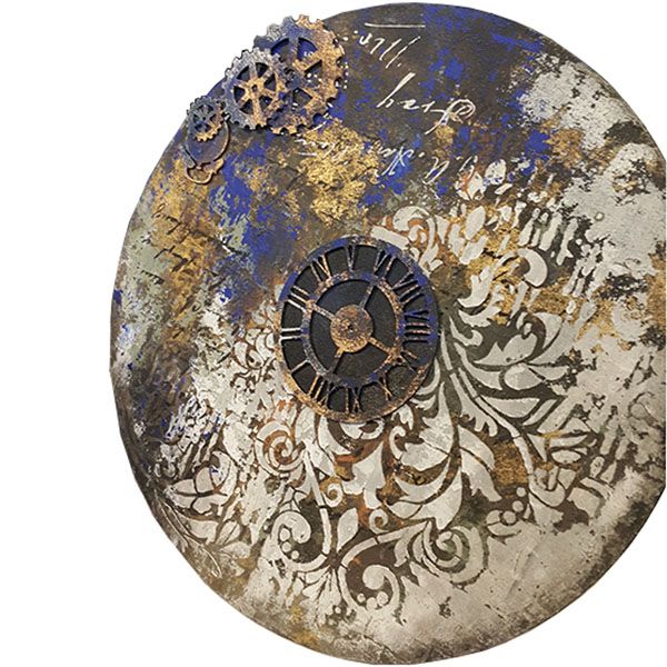 На занятии делаем часы диаметром 50 см. Работаем с различными красками, пастами, патинами, трафаретами, поталью, морданом и другими материалами в различных сочетаниях. Активно используем новые пасты, изучая их обширные возможности и применяя смелые цвета.