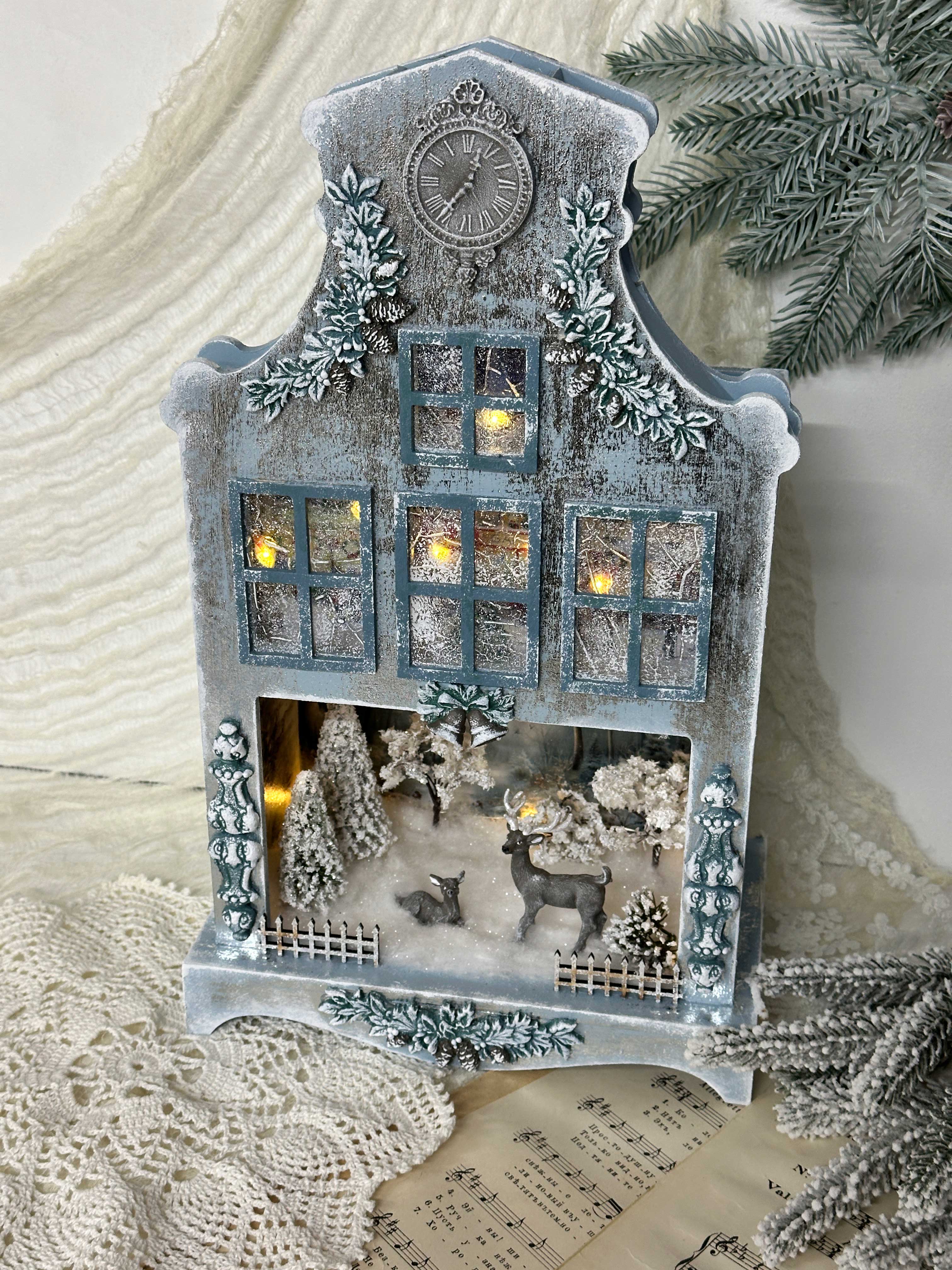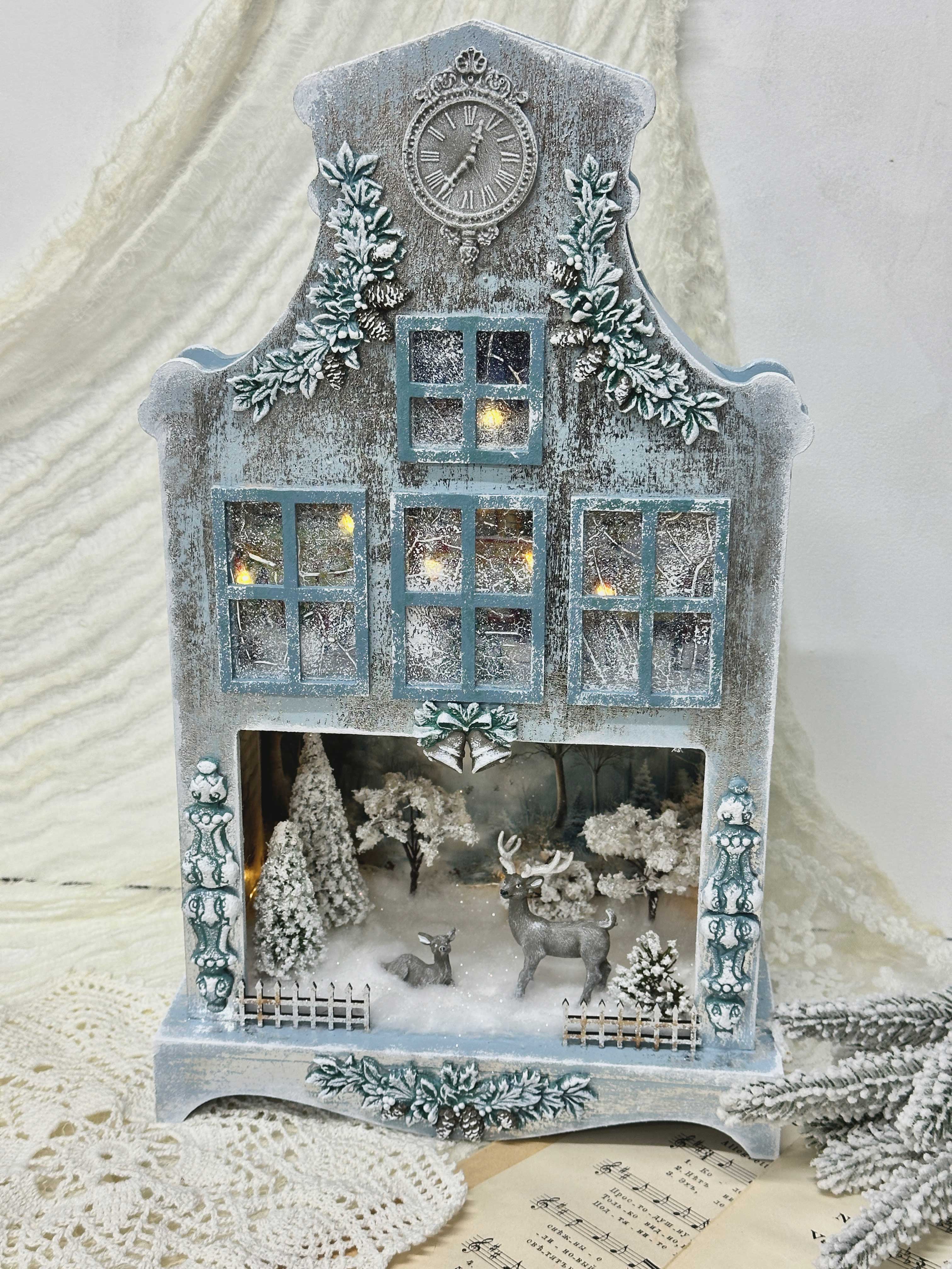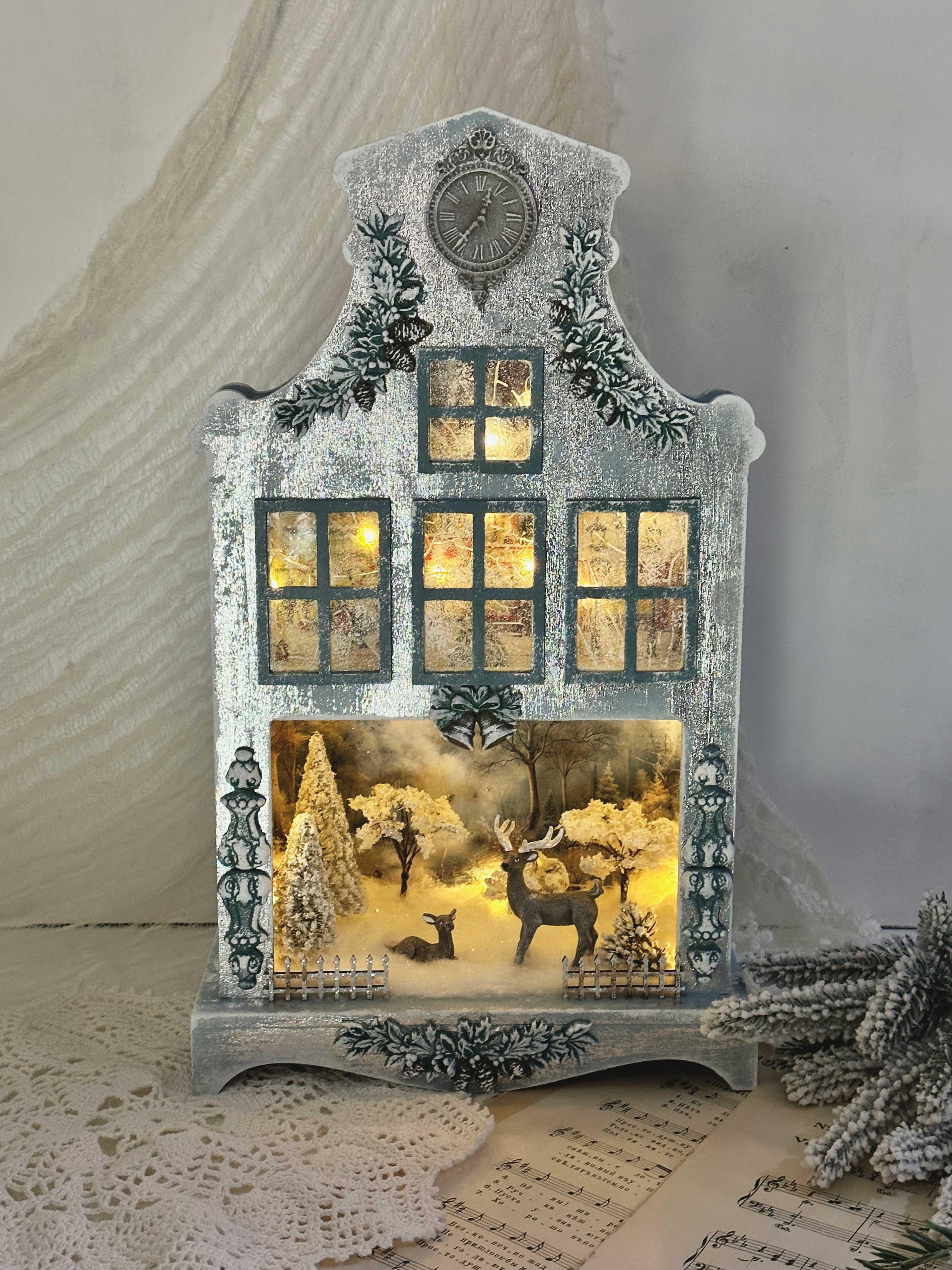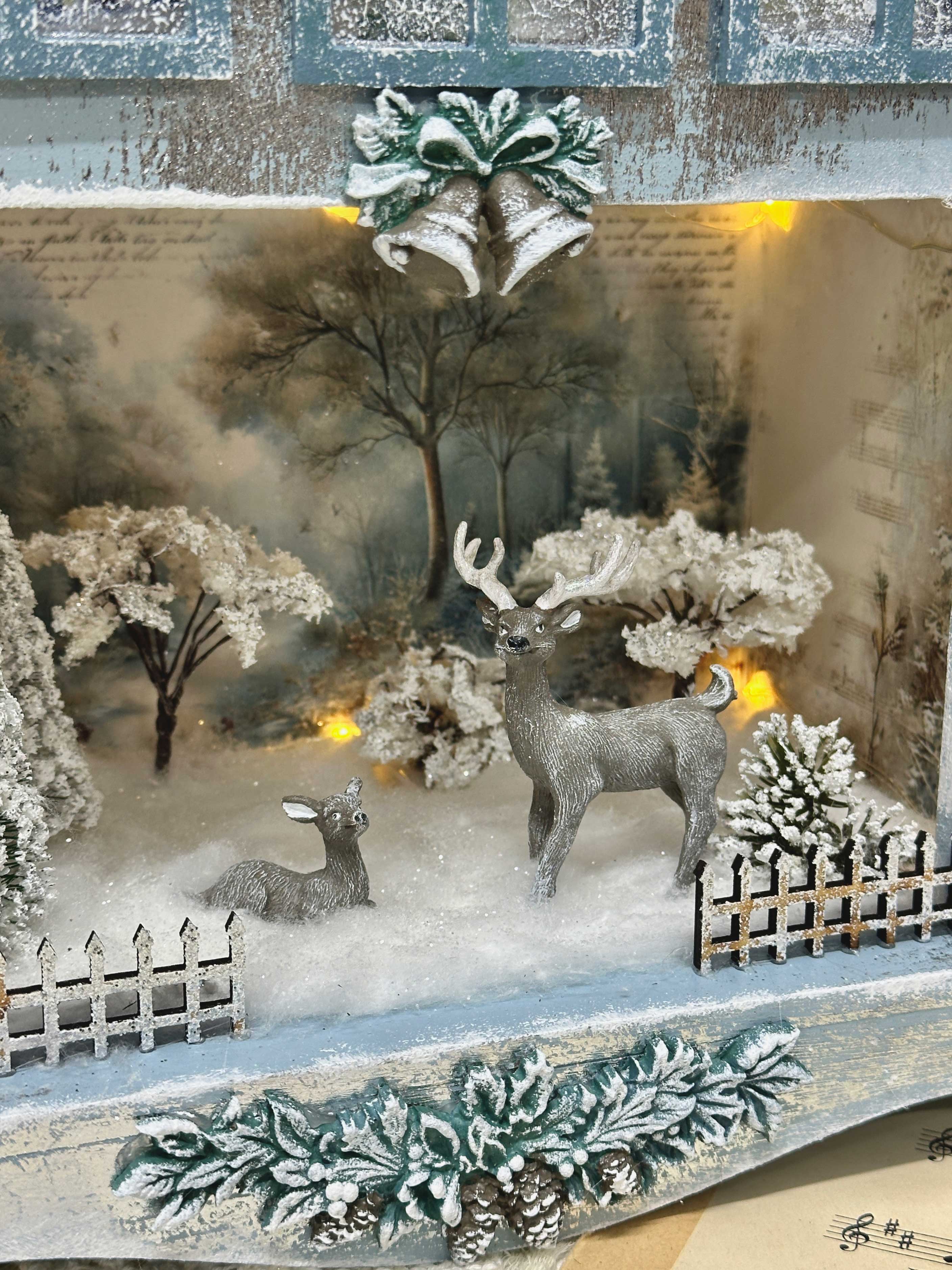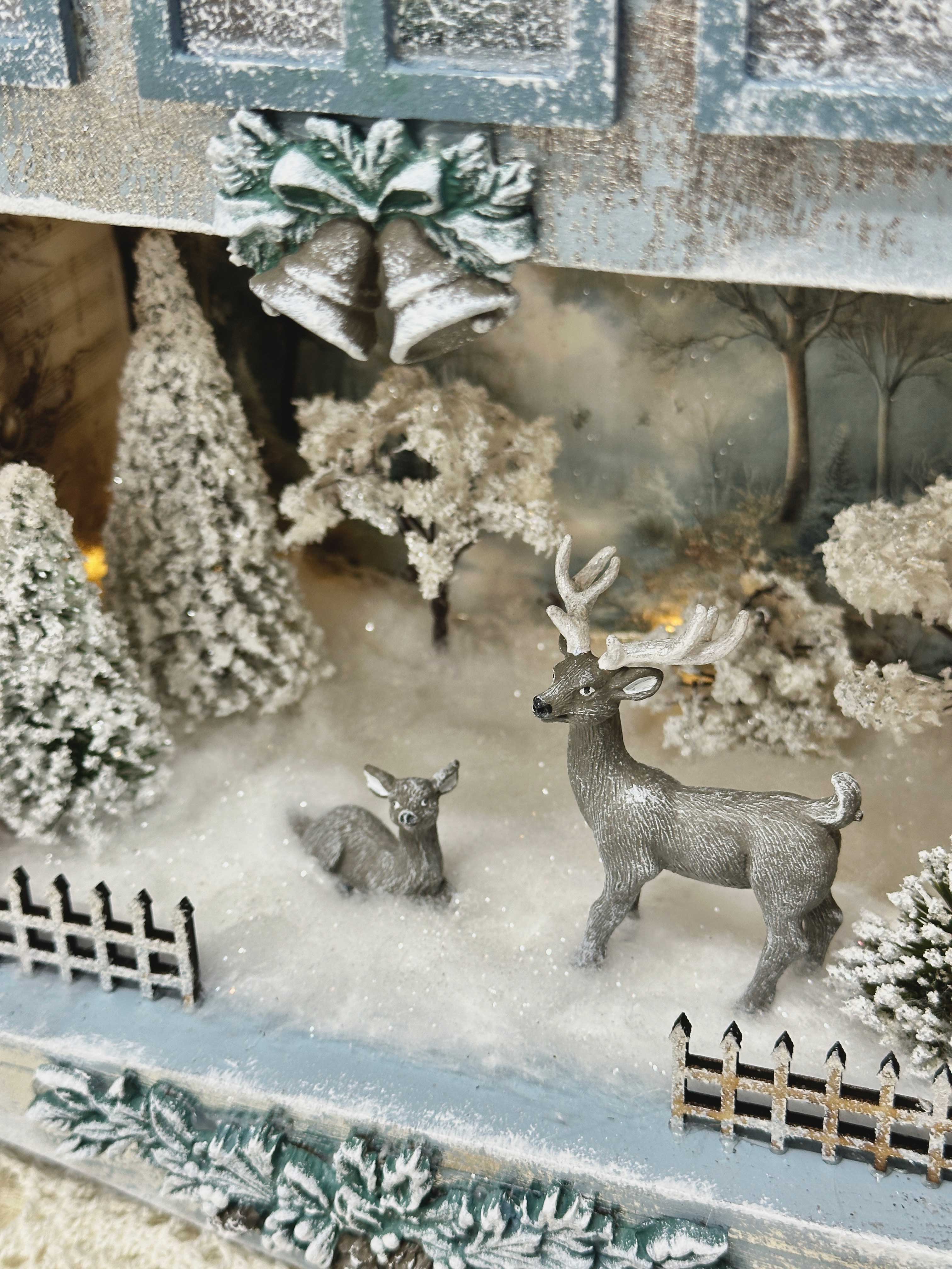 - Поработаем с миниатюрами и макетными материалами, соберём уютный зимний сюжет с лесом и оленями.