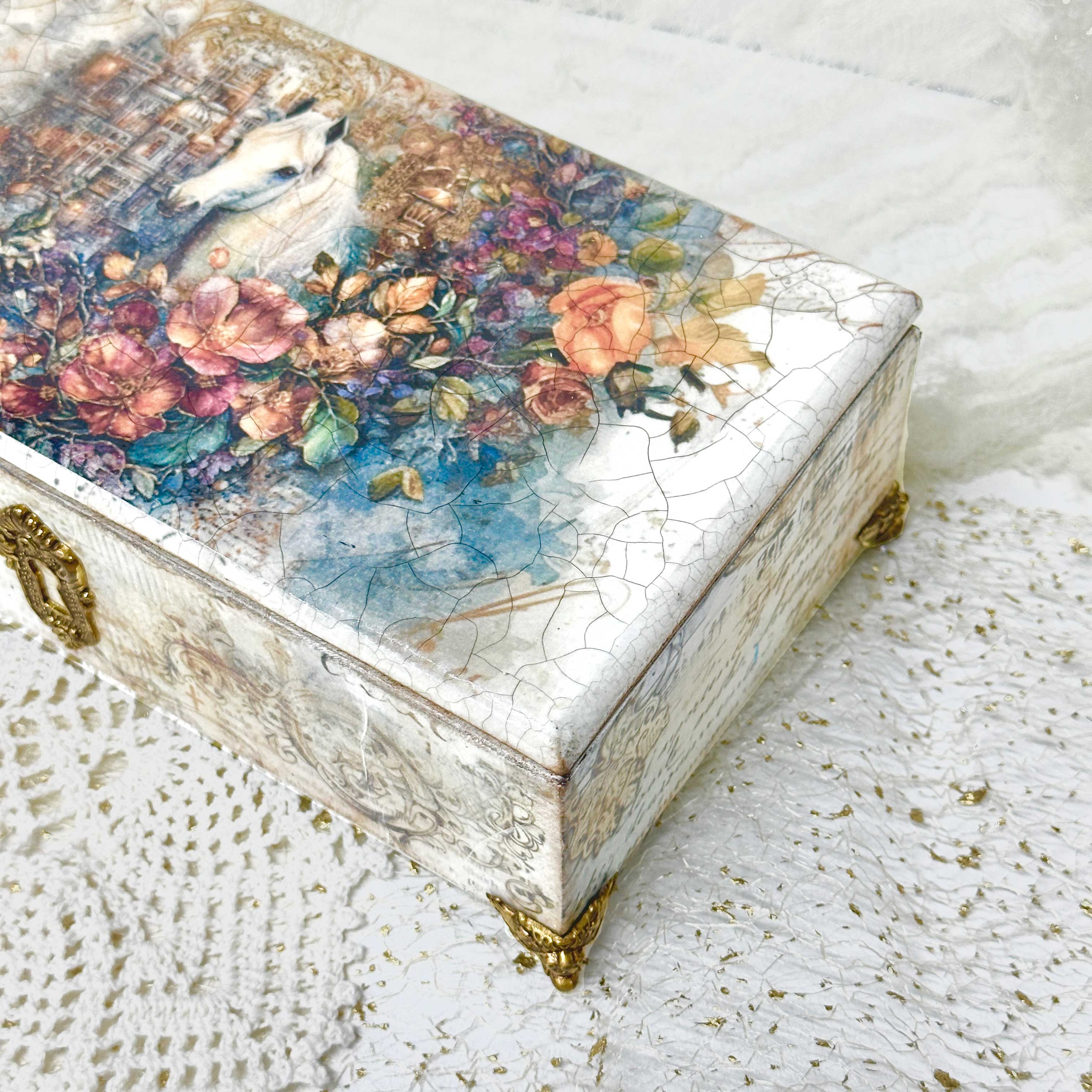 - Применим декупаж и создадим эффектный кракелюр — те самые винтажные трещинки, которые придают работе особый шарм;