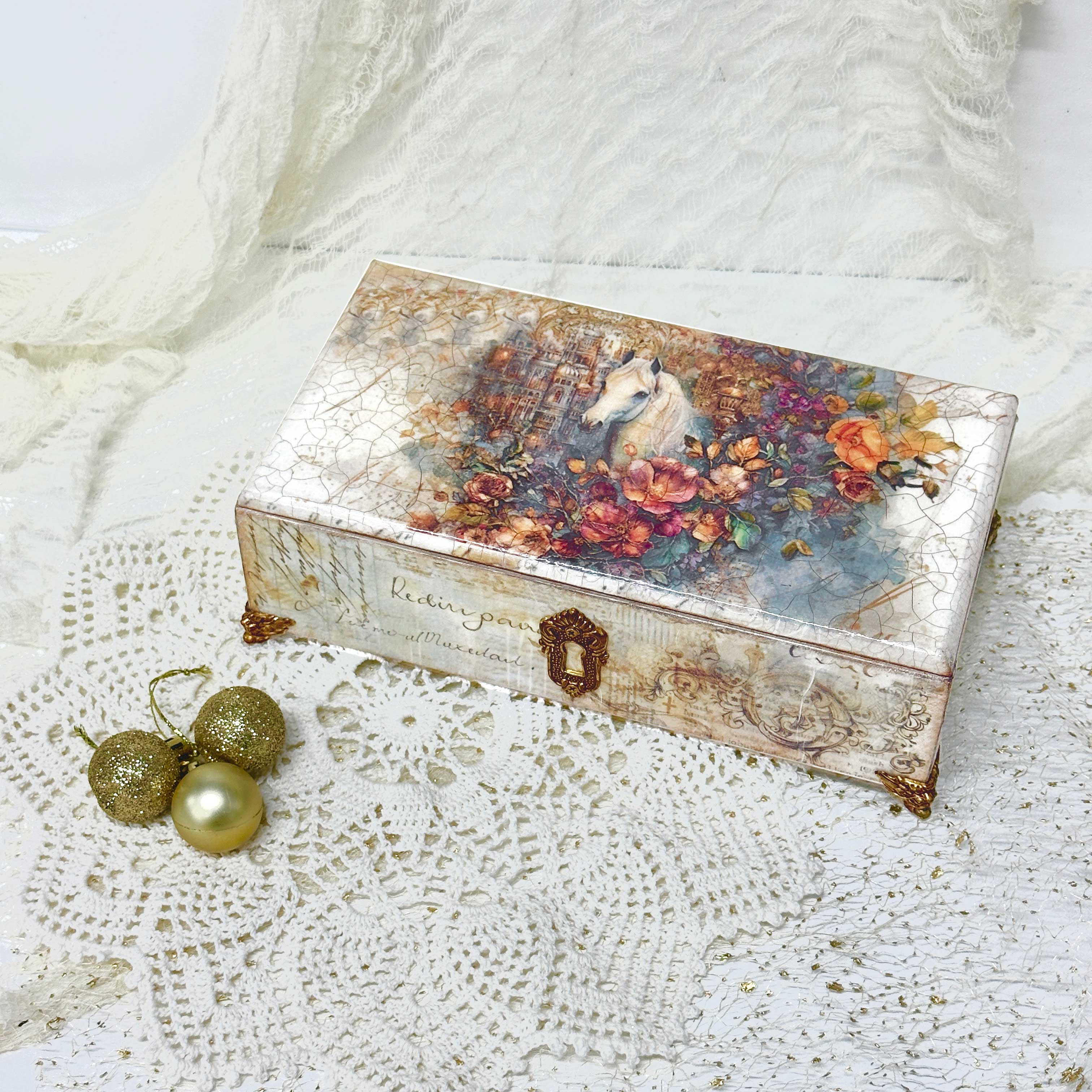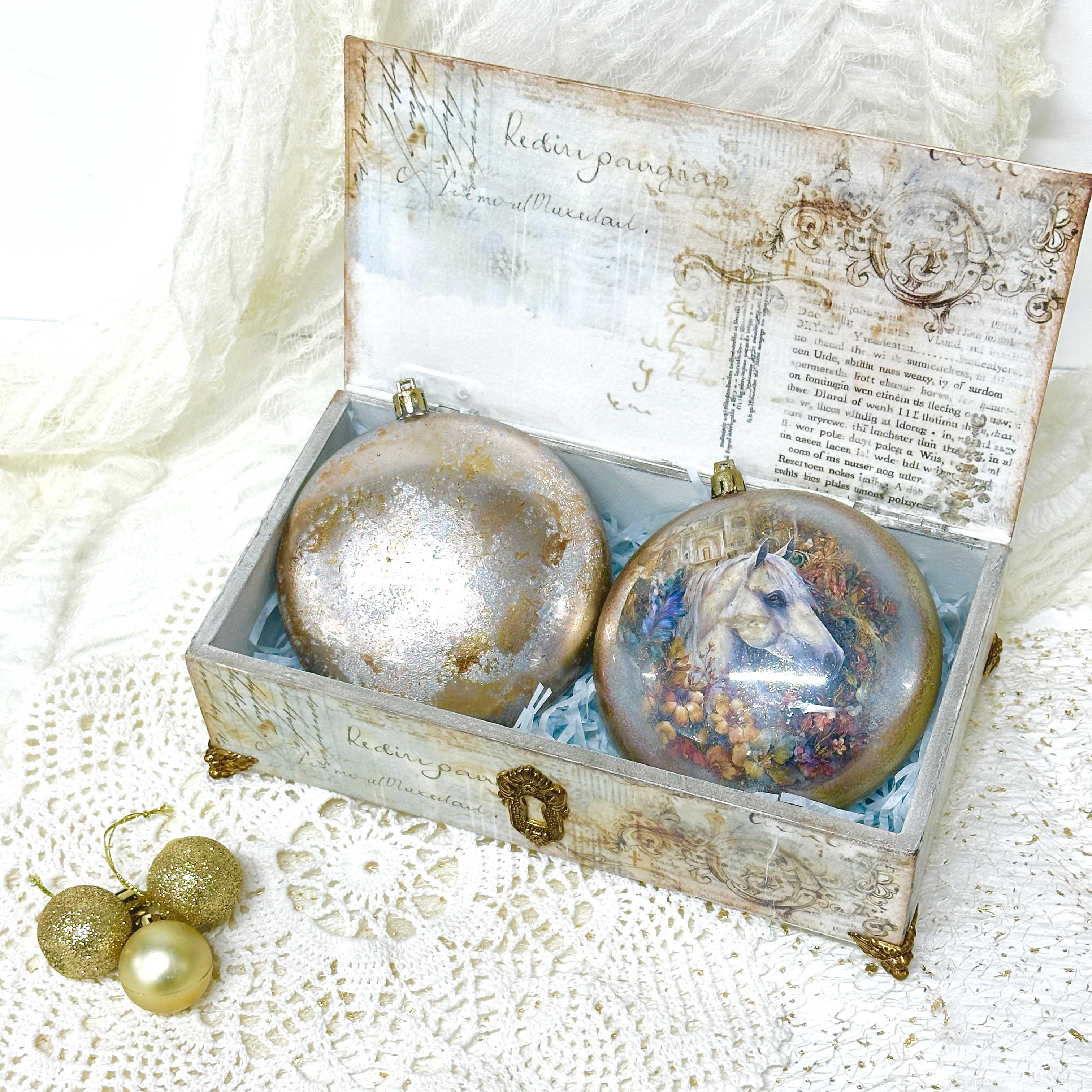 На мастер-классе мы сделаем шикарную шкатулку с двумя медальонами, елочными игрушками. В процессе: