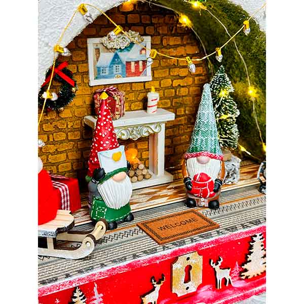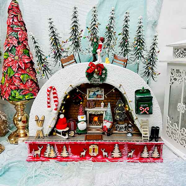 За снежными аллеями, вдоль которых горят огоньки и стоят заснеженные ёлочки, скрывается тёплый и уютный мир гномов. Эта композиция завораживает своим контрастом: снаружи — холодный зимний парк, а внутри — уютный домик с горящим камином, где гномы готовятся к празднованию Нового года. Этот мастер-класс объединяет в себе две противоположные атмосферы — зимнюю прохладу и тёплое домашнее тепло, воплощённые в одной работе.