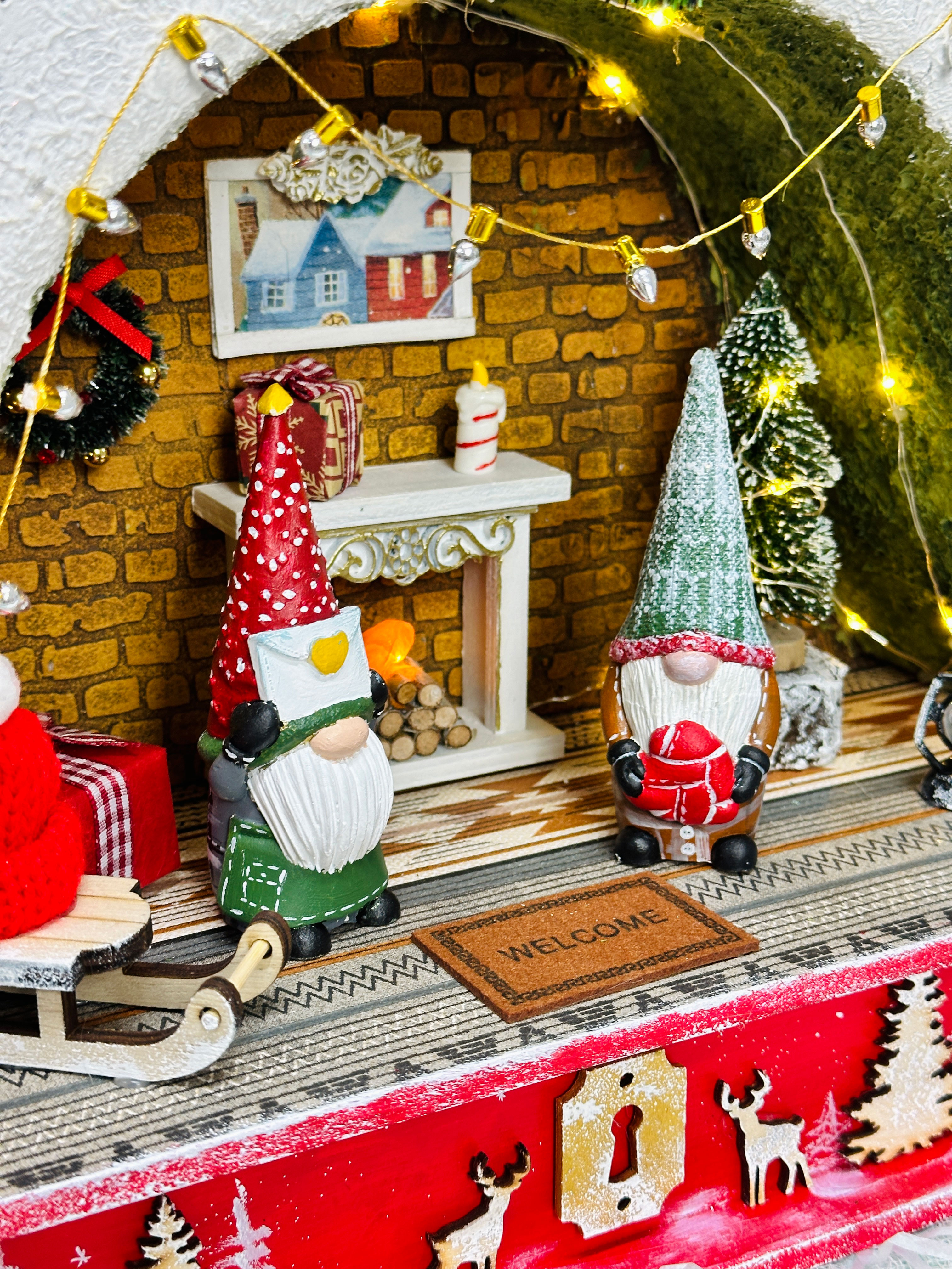 - Раскрасите гномов, придав им новогодние цвета, оживите домик светом камина и волшебных огоньков.